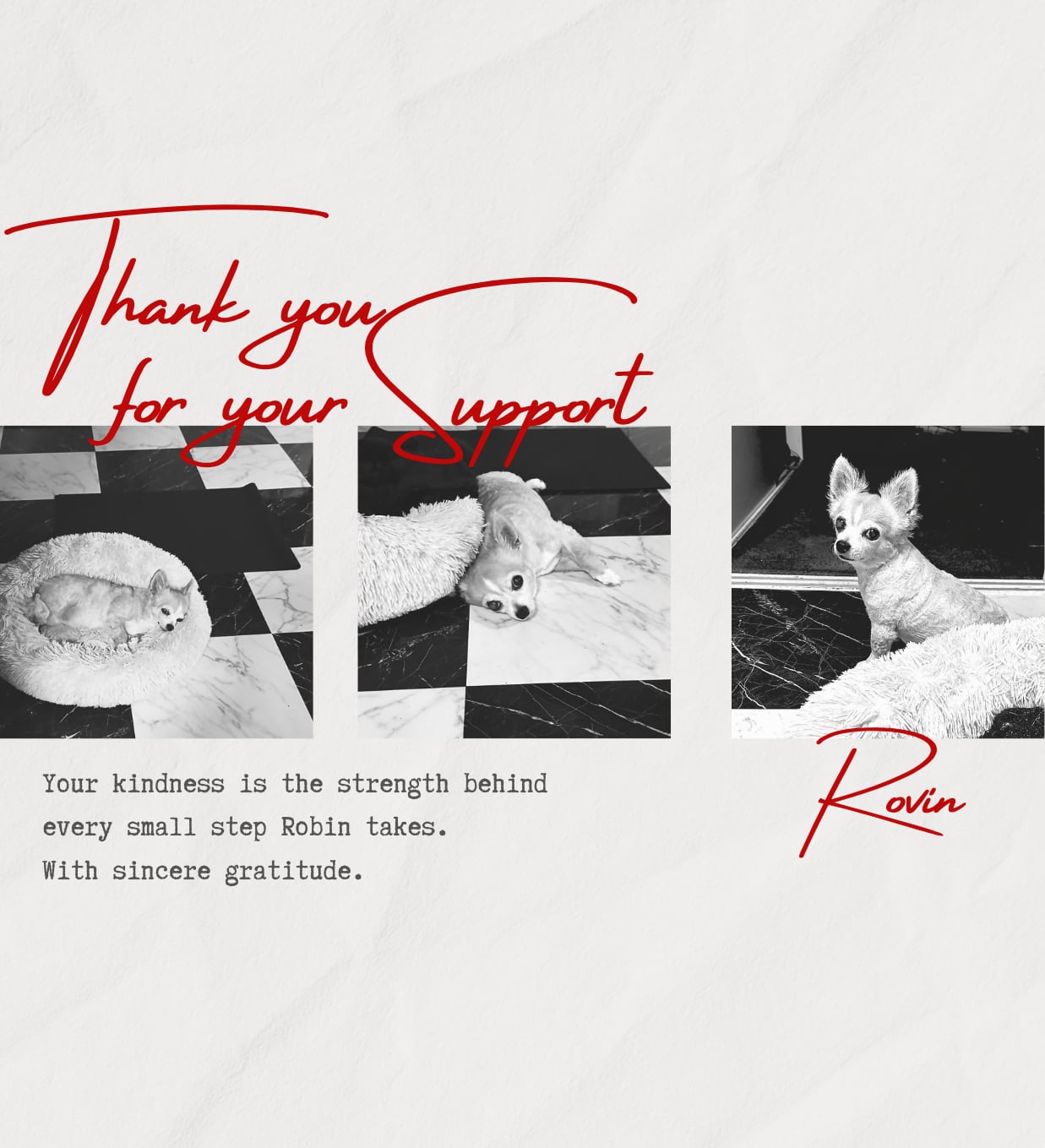 本プロジェクトは、「グッズの制作費や送料をかけるよりも、1円でも多くロビンの医療費に充ててほしい」という温かいお声から生まれました。
